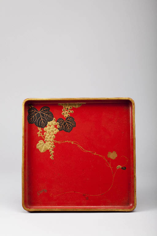 Vassoio di forma all'incirca quadrata laccato di rosso con decorazione di tralcio, foglie e grappolo d'uva (budo) in oro e nero.. Piante: uva