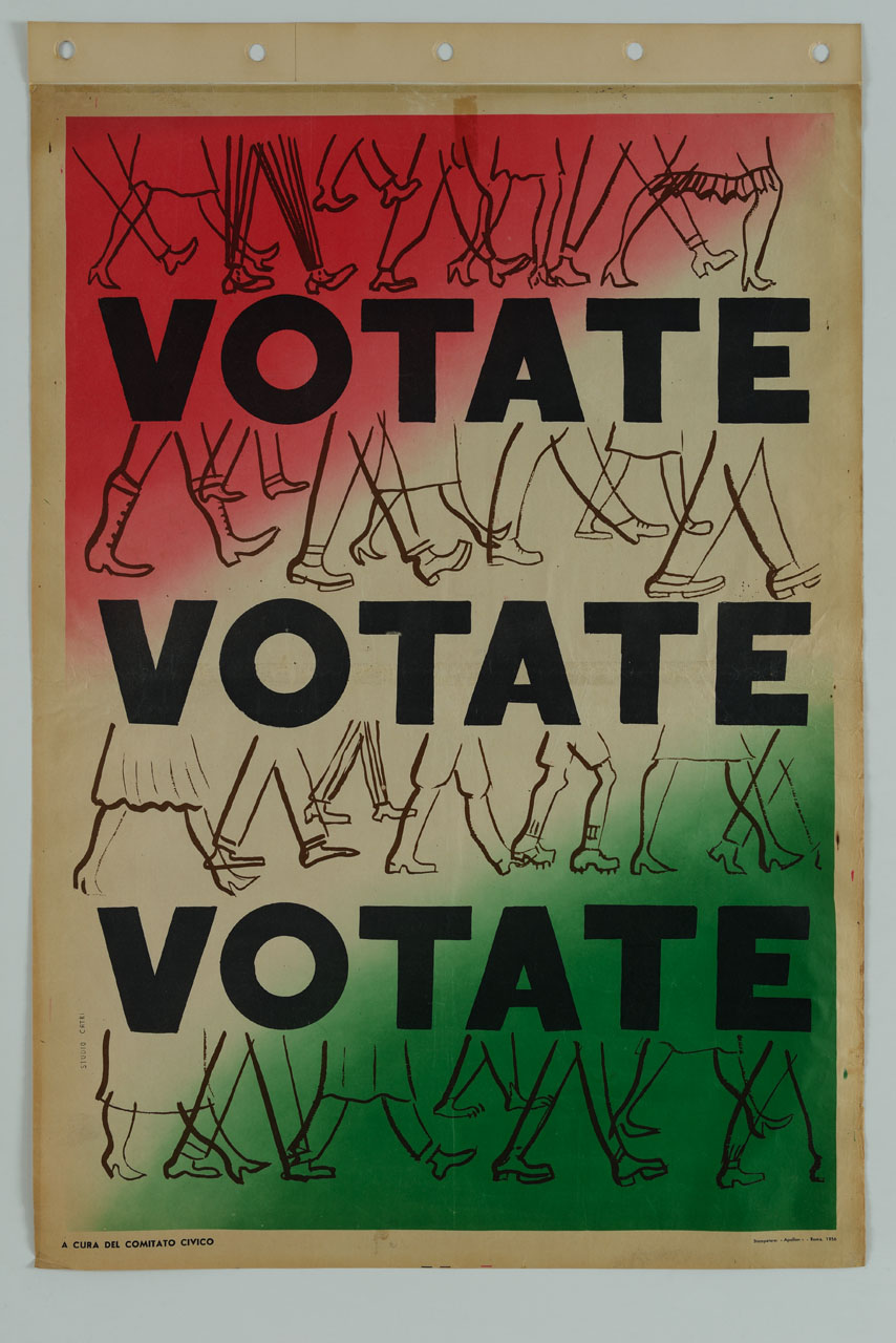 Lettura iconografica: gambe; tricolore. Categoria merceologica/ tipo evento: politica; movimenti politici; informazione e comunicazione; propaganda politica; propaganda elettorale. Nomi: Comitato Civico