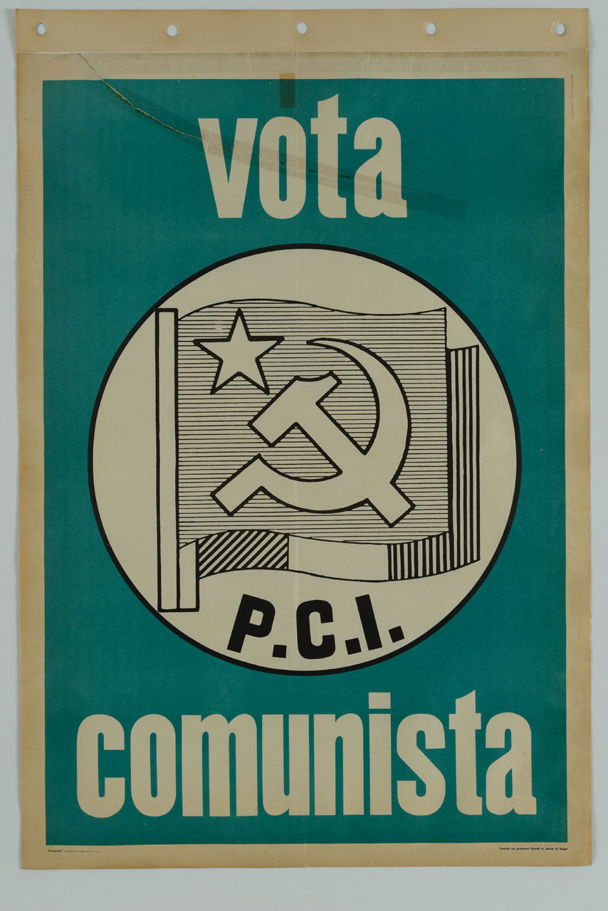 Lettura iconografica: simbolo politico. Categoria merceologica/ tipo evento: politica; partiti politici; informazione e comunicazione; propaganda politica; propaganda elettorale. Nomi: PCI; Partito Comunista Italiano