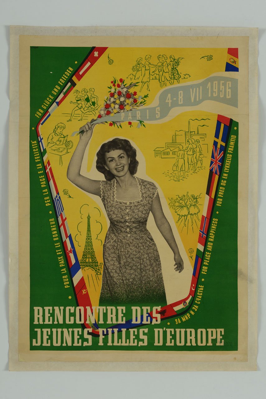 Lettura iconografica: figura femminile; sagome di figure impegnate in attività ricreative; tour Eiffel. Categoria merceologica/ tipo evento: tempo libero; manifestazioni. Nomi: Rencontre des jeunes filles d'Europe. Luoghi: Francia; Paris; Parigi