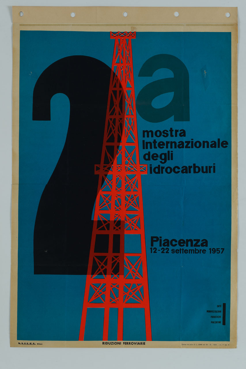 Lettura iconografica: traliccio metallico. Categoria merceologica/ tipo evento: industria mineraria ed estrattiva; giacimento di gas naturale; metano; giacimento di petrolio greggio; industria meccanica; macchine utensili per l'industria mineraria ed estrattiva; macchine utensili per l'industria petrolifera; industria metallurgica; strutture metalliche; mostre; riduzioni ferroviarie; associazioni economiche. Nomi: 2 Mostra Internazionale degli Idrocarburi; Ente Manifestazioni Fieristiche Piacentine. Luoghi: Piacenza