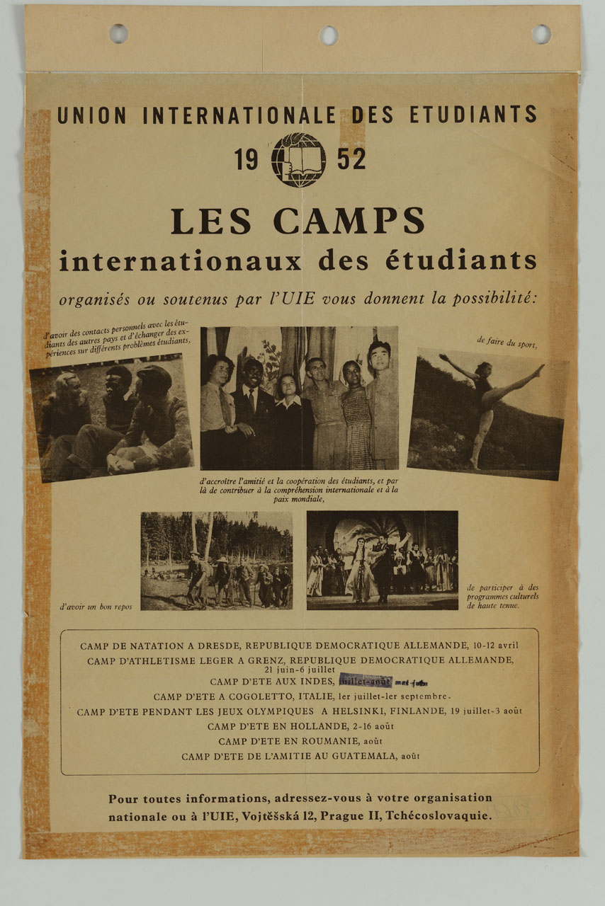 Lettura iconografica: figure maschili; figure femminile; libro; colombe; bandiera dell'Unione internationale degli studenti. Categoria merceologica/ tipo evento: tempo libero; manifestazioni; raduno; sport; manifestazioni sportive; giochi della gioventù. Nomi: Les camps internationaux des étudiants; UIE; Union internationale des étudiants. Luoghi: Republique Democratique Allemande; Repubblica Democratica Tedesca; Germania; Dresde; Dresda; Grenze; Indes; India; Italie; Italia; Genova; Cogoletto; Finlande; Finlandia; Helsinki; Hollande; Olanda; Roumanie; Romania; Guatemala
