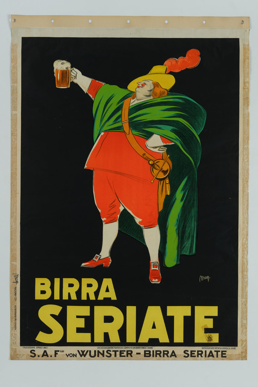 Lettura iconografica: figura maschile; moschettiere; boccale; birra. Categoria merceologica/ tipo evento: industria alimentare; bevande; birra. Nomi: Birra Seriate; Enrico Von Wunster