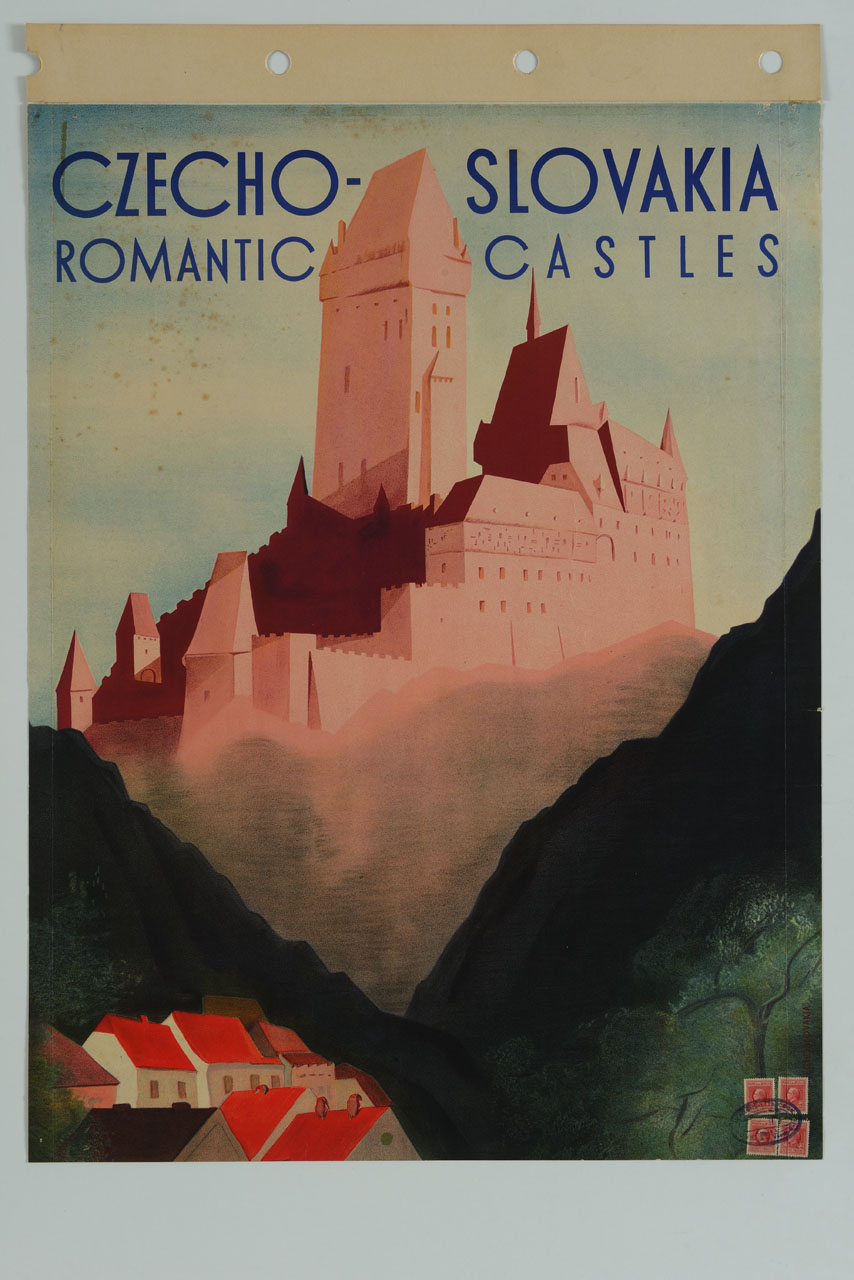 Lettura iconografica: castello; vallata; pendii; paese; case; comignoli; tetti. Categoria merceologica/ tipo evento: tempo libero; turismo; castello. Nomi: castello di Karlštejn; Carlo IV di Lussemburgo. Luoghi: Cecoslovacchia; Boemia; Praga