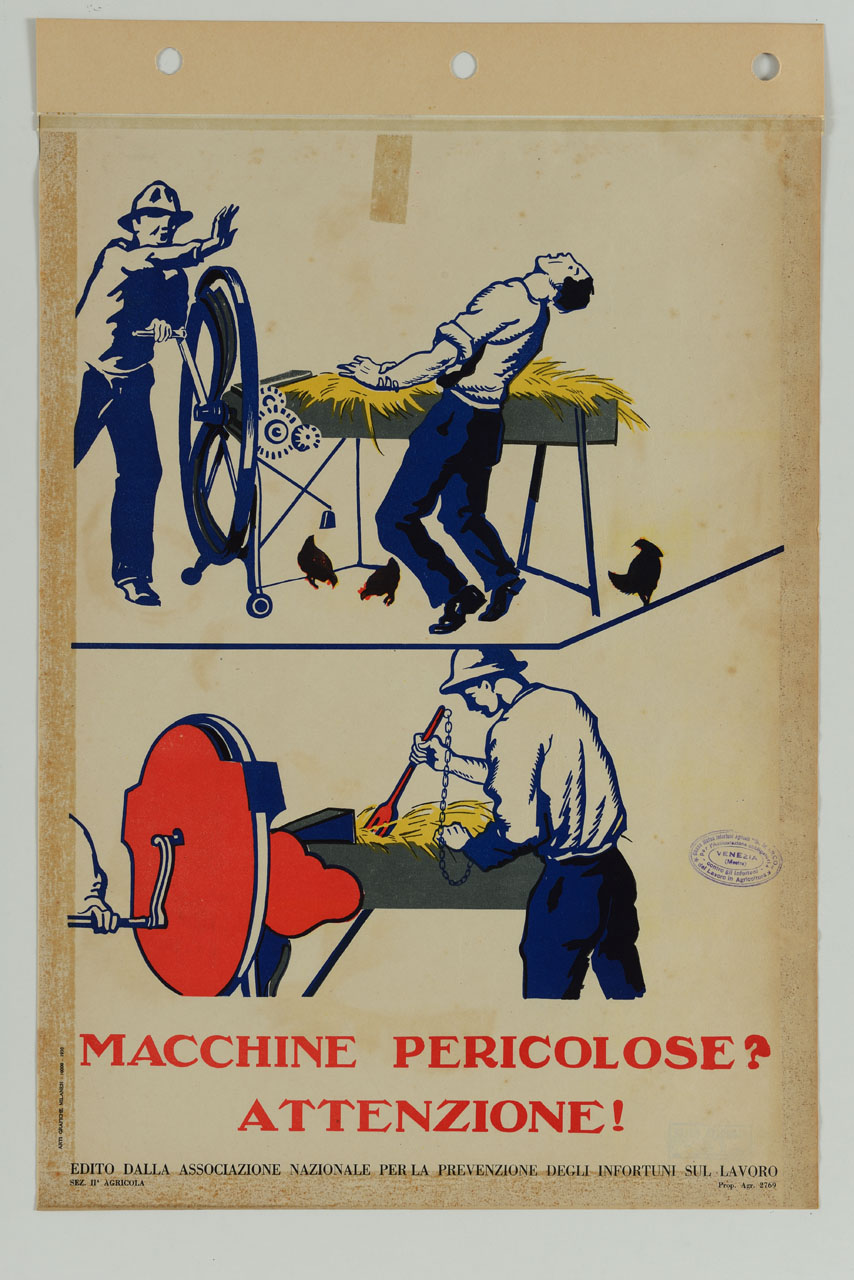 Lettura iconografica: figure maschili; pollame; fieno; ingranaggi; macchina agricola. Categoria merceologica/ tipo evento: informazione e comunicazione; propaganda antinfortunistica; associazioni sociali; agricoltura; associazioni agricole; previdenza sociale; associazioni previdenziali; attività finanziarie e assicurative; assicurazioni; polizza infortuni. Nomi: Associazione Nazionale per la Prevenzione degli Infortuni sul Lavoro; Cassa Mutua Infortuni Agricoli San Marco. Luoghi: Venezia; Mestre