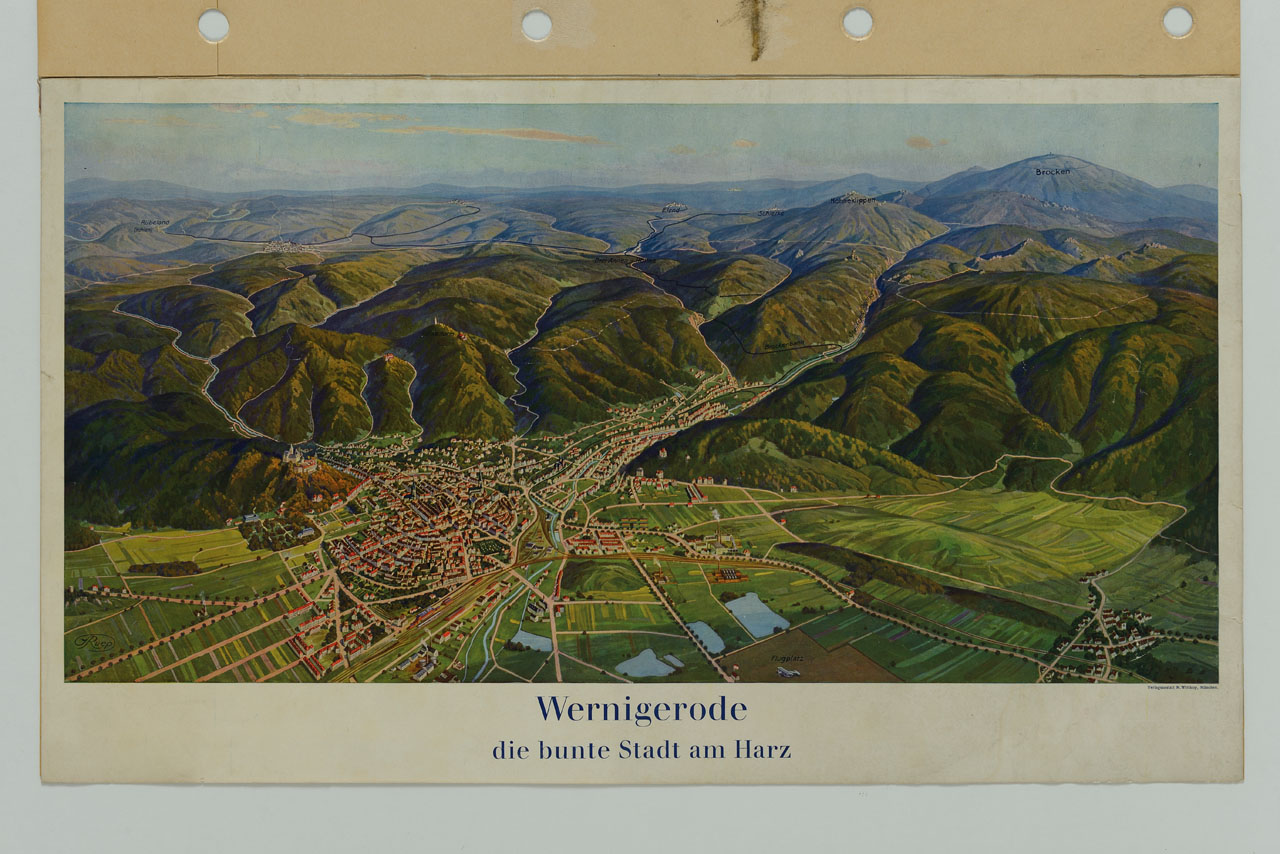 Lettura iconografica: città; laghi; fiumi; canali; montagne; roccia; ghiacciai; valli; pianure; prati; vegetazione; campi; case; palazzi; industrie; tetti; camini; fumo; campanili; chiese; strade; comunicazioni; ferrovie; aeroporto. Categoria merceologica/ tipo evento: informazione e comunicazione; editoria; carta geografica; tempo libero; turismo. Nomi: Wernigerode. Luoghi: Wernigerode; Sassonia-Anhalt; Germania