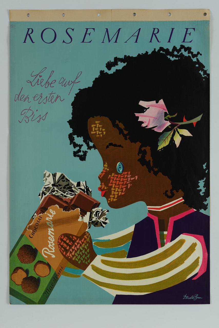 Lettura iconografica: figura femminile; bambina; tavoletta di cioccolato. Categoria merceologica/ tipo evento: industria alimentare; cioccolato; dolciumi al cioccolato; tavoletta di cioccolato. Nomi: Rosemarie; Maestrani. Luoghi: Svizzera; Canton San Gallo; San Gallo; Flawil