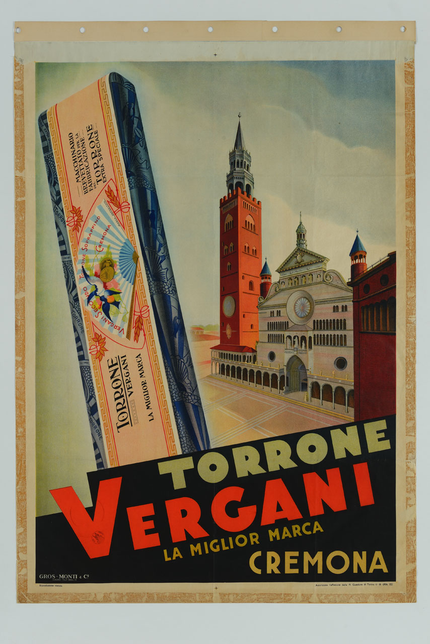 Lettura iconografica: confezione di torrone; veduta di città; architetture; duomo; battistero; Torrazzo. Categoria merceologica/ tipo evento: industria alimentare; dolciumi; torrone. Nomi: Secondo Vergani. Luoghi: Cremona