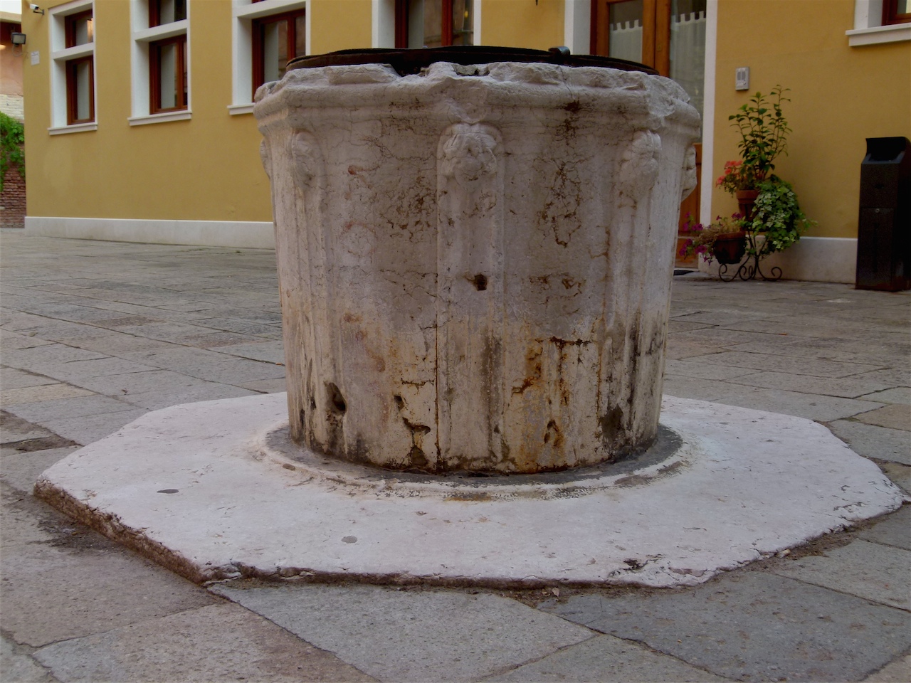 forma ottagonale alla sommità e circolare alla base, con agli angoli, sotto la cornice di coronamento, foglie acquatiche rovesciate. La cornice è composta da abaco, toro e listello. Nella parte inferiore basamento ottagonale con cornice circolare in prossimità del fusto. La vera è coperta da lastra metallica piatta.. decorazioni
