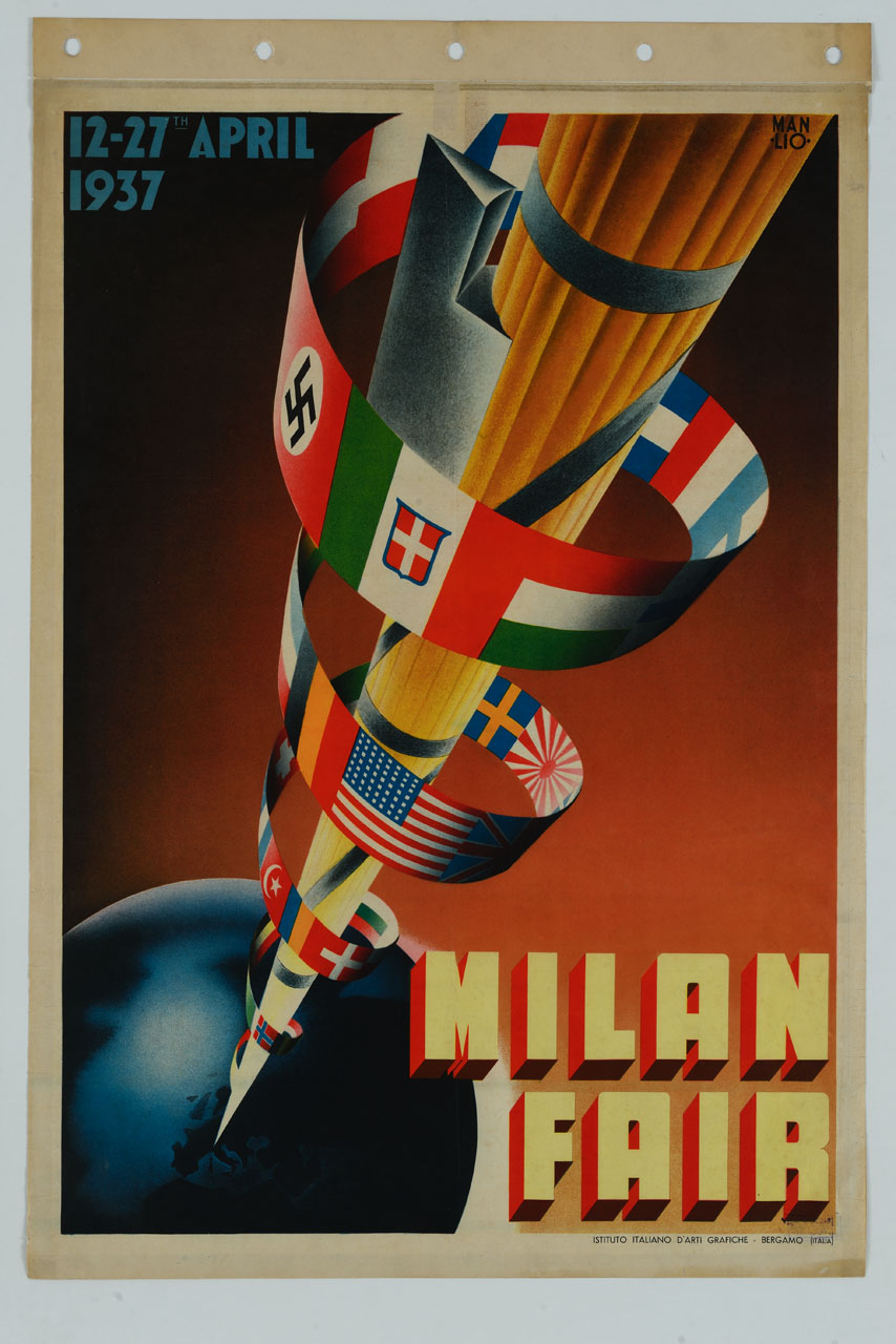 Lettura iconografica: fascio littorio; mappamondo; bandiere; bandiera monarchia italiana; bandiera tedesca del Terzo Reich; bandiera statunitense; bandiera turca; bandiera giapponese; bandiera del Regno Unito; bandiera svedese. Categoria merceologica/ tipo evento: commercio; industria; artigianato; agricoltura; fiere. Nomi: fiera. Luoghi: Milano