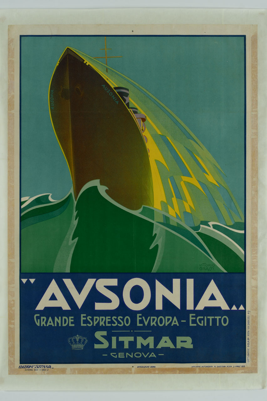 Lettura iconografica: nave; transatlantico; prua; mare; onde. Categoria merceologica/ tipo evento: trasporti; trasporto marittimo; compagnia di navigazione; nave da crociera; transatlantico; turismo; crociere. Nomi: Ausonia; SITMAR; Società Italiana di Servizi Marittimi. Luoghi: Genova