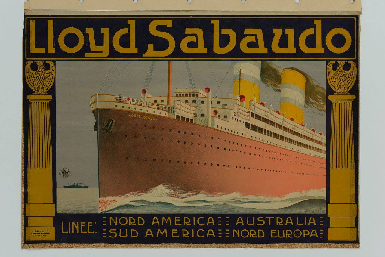 Lettura iconografica: navi; transatlantico; mare. Categoria merceologica/ tipo evento: trasporto marittimo; compagnia di navigazione. Nomi: Lloyd Sabaudo; Conte Rosso. Luoghi: Torino; Genova