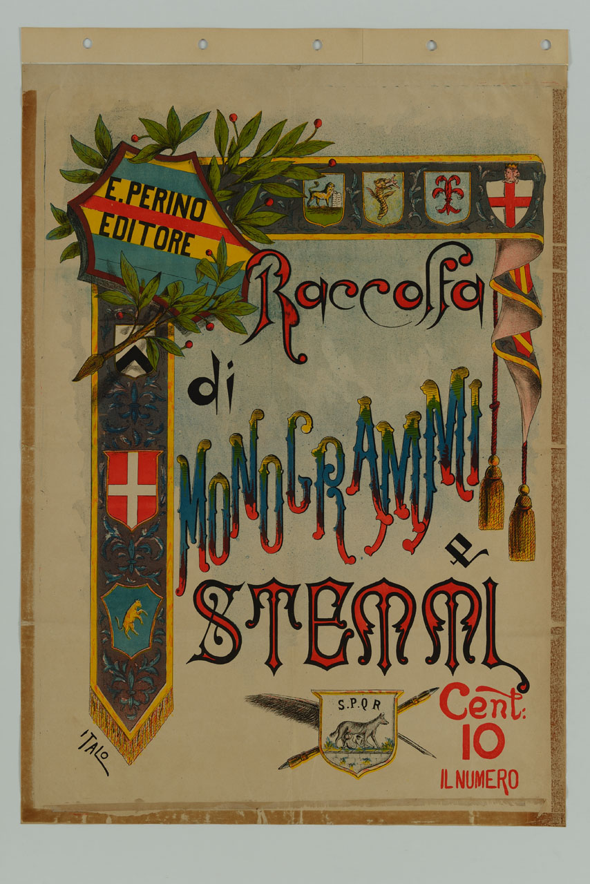 Lettura iconografica: bande di tessuto; stemmi; tabella; ramo di alloro. Categoria merceologica/ tipo evento: informazione e comunicazione; editoria; libro; libro a dispense; araldica. Nomi: Raccolta di monogrammi e stemmi; Edoardo Perino Editore. Luoghi: Roma