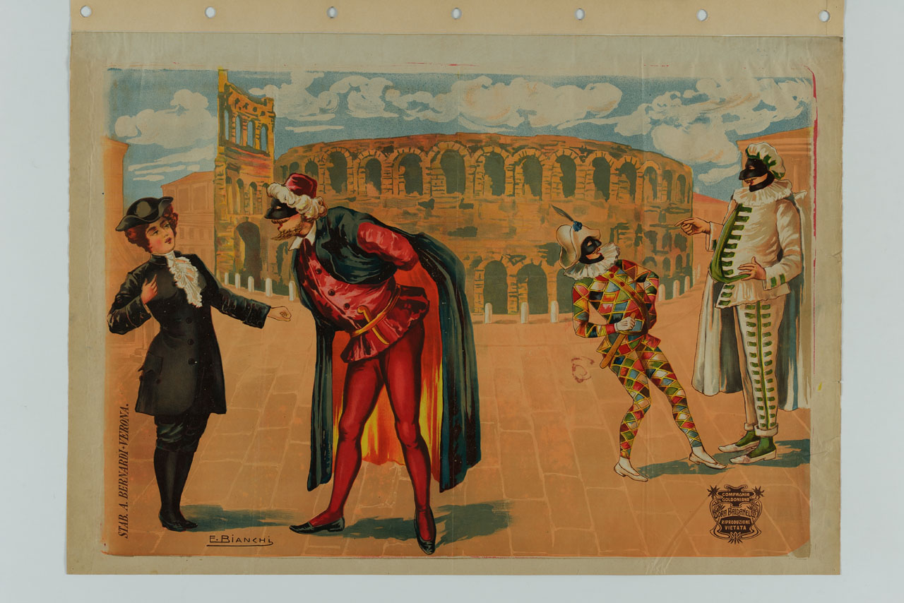 Lettura iconografica: figure maschili; figura femminile; maschere della Commedia dell'Arte; Balanzone; Pantalone; Arlecchino; Brighella; architetture; Arena di Verona. Categoria merceologica/ tipo evento: spettacolo; teatro; prosa. Nomi: Carlo Goldoni; Compagnia goldoniana Dora Baldanello