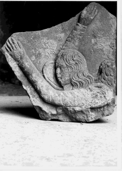Il frammento è ornato da una figura di angelo con lunghi capelli ondulati e braccia sollevate.. Figure: angelo