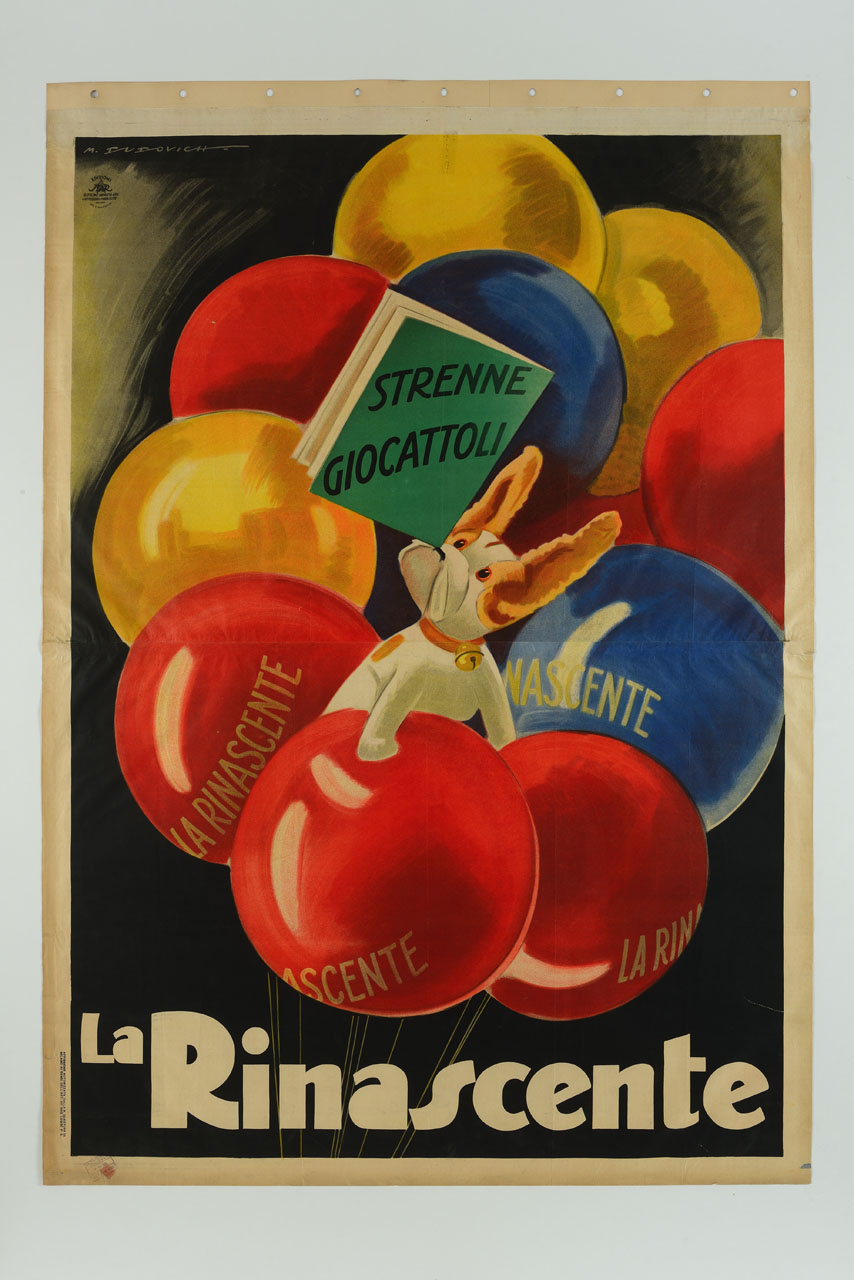 Lettura iconografica: cagnolino di pezza; palloncini gonfiabili; riviste; catalogo di giocattoli. Categoria merceologica/ tipo evento: commercio; grandi magazzini; giochi e giocattoli. Nomi: la Rinascente; Luigi Bocconi; Ferdinando Bocconi; Senatore Borletti; Milano. Luoghi: Italia; Padova