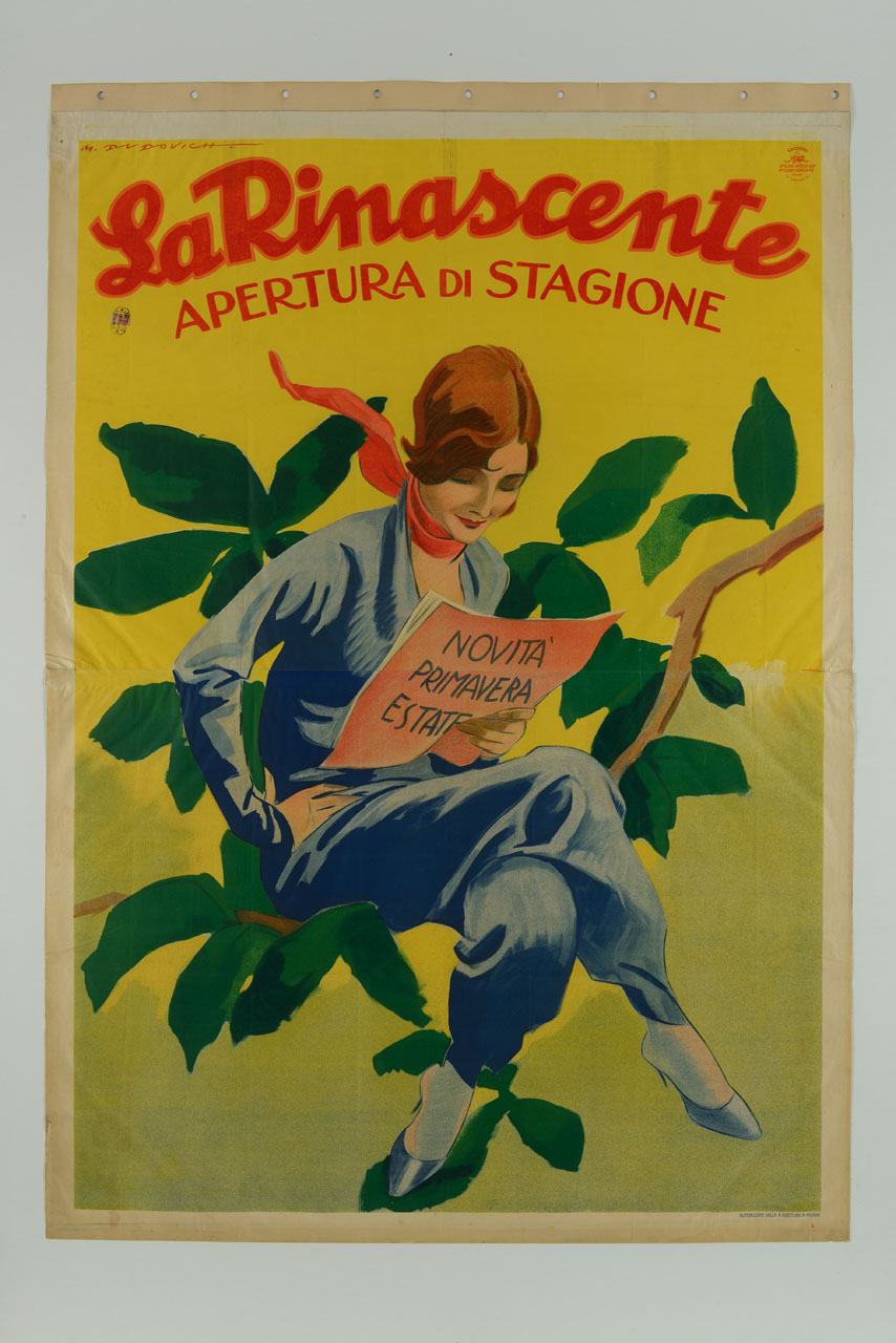 Lettura iconografica: figura femminile; abbigliamento; abiti primaverili; abito pantalone azzurro; foulard rosso; albero; ramo; foglie verdi; riviste; catalogo d'abbigliamento. Categoria merceologica/ tipo evento: commercio; grandi magazzini; abbigliamento. Nomi: la Rinascente; Luigi Bocconi; Ferdinando Bocconi; Senatore Borletti. Luoghi: Italia; Milano