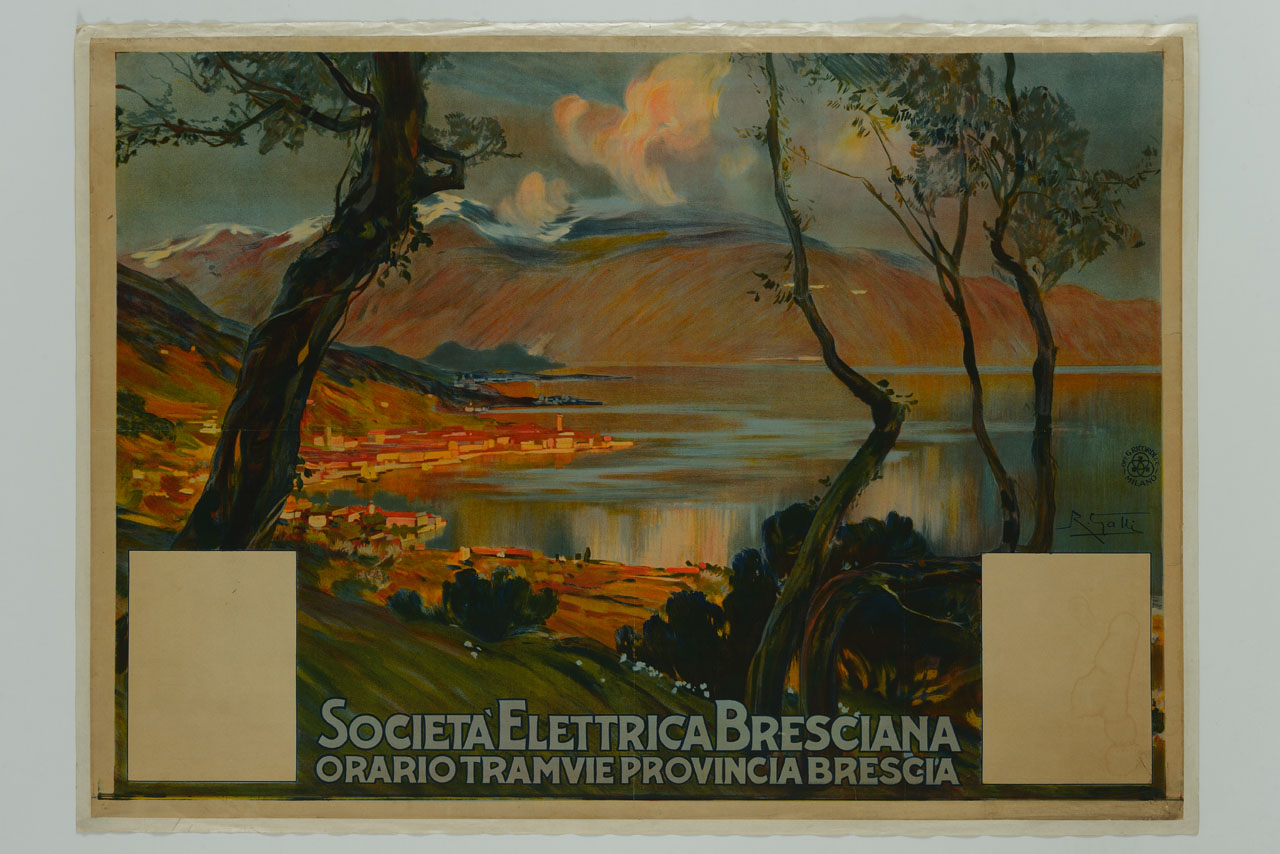 Lettura iconografica: paesaggio lacustre; lago; montagne; catena montuosa; paese; alberi. Categoria merceologica/ tipo evento: industria elettrica; trasporti; trasporto terrestre; tram. Nomi: Società Elettrica Bresciana. Luoghi: Brescia