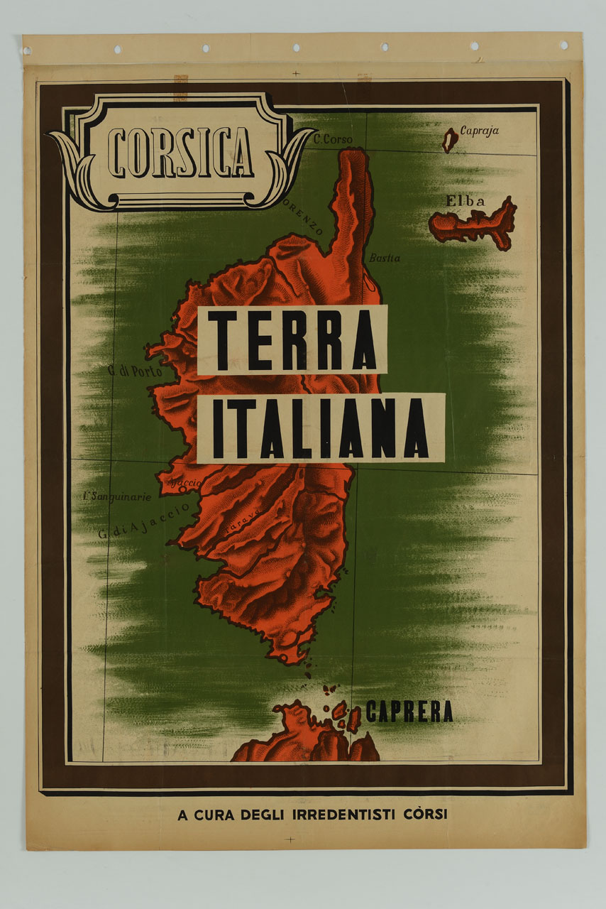 Lettura iconografica: carta geografica. Categoria merceologica/ tipo evento: politica; movimenti politici. Nomi: Irredentisti Corsi. Luoghi: Corsica