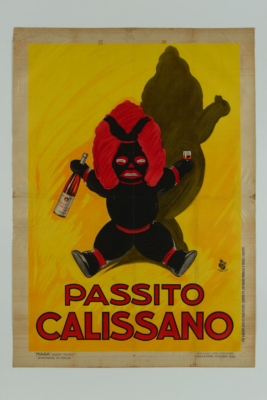 Lettura iconografica: personaggio di fantasia; bottiglia; bicchiere. Categoria merceologica/ tipo evento: industria alimentare; bevande; vini speciali; passito. Nomi: Passito Calissano; Luigi Calissano figli S. A. Luoghi: Cuneo; Alba
