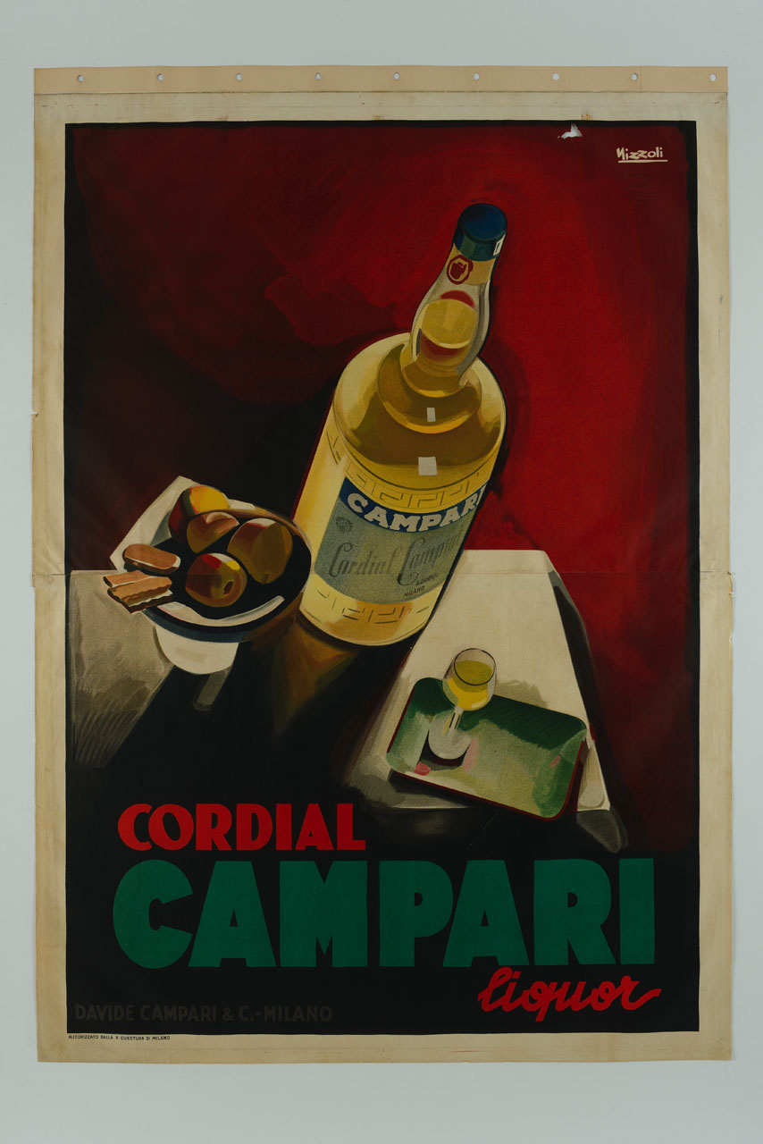 Lettura iconografica: tavolino; bottiglia; bicchierino; vassoio; ciotola; biscotti; frutta. Categoria merceologica/ tipo evento: industria alimentare; bevande; liquori. Nomi: Cordial Campari; Davide Campari C.. Luoghi: Milano