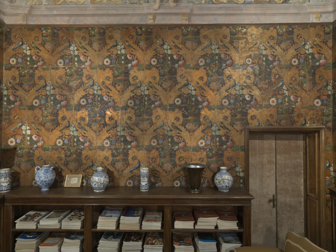decorazione seriale, su modulo quadrato, a motivi di vasi con fiori coronati da coppie di uccelli su fondo dorato e punzonato di motivi a fogliame. Decorazioni: vasi di fiori e uccelli