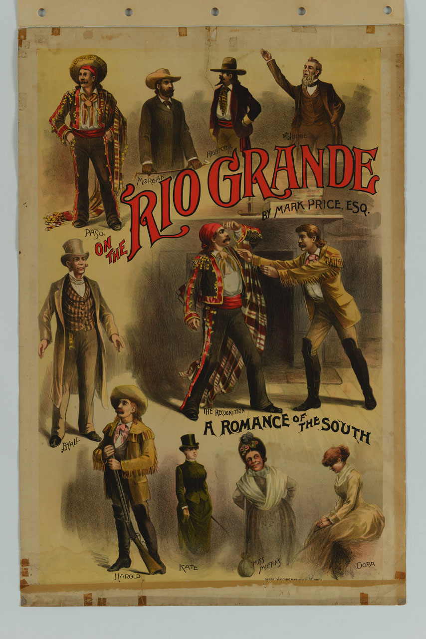 Lettura iconografica: figure maschili; figure femminili; camino; candelabro; scatola. Categoria merceologica/ Tipo evento: spettacolo; teatro; musica; opera lirica. Nomi: On the Rio Grande; Mark Price ESQ; Paso; Morgan; Highflyer; the Jodge; Byall; Harold; Kate; Miss Muffins; Dora. Luoghi: Stati Uniti d'America