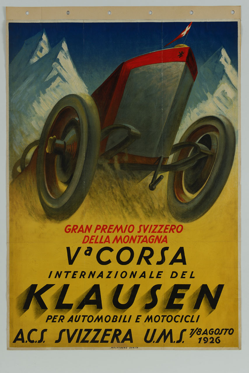 Lettura iconografica: veduta montana; automobile; bandierina; simbolo nazionale; croce bianca in campo rosso. Categoria merceologica/ tipo evento: sport; gare; automobilismo; motociclismo; associazioni sociali. Nomi: V Corsa internazionale del Klausen; Gran Premio svizzero della montagna; ACS; Automobile Club Svizzera UMS. Luoghi: Svizzera; passo del Klausen