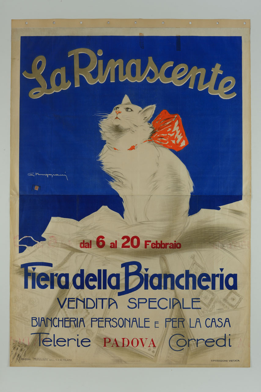 Lettura iconografica: animali; gatto bianco; fiocco rosso; biancheria per la casa; biancheria personale. Categoria merceologica/ tipo evento: commercio; grandi magazzini; abbigliamento; industria tessile; biancheria per la casa. Nomi: la Rinascente; Luigi Bocconi; Ferdinando Bocconi; Senatore Borletti; Milano; fiera della biancheria; gatto persiano. Luoghi: Italia; Padova