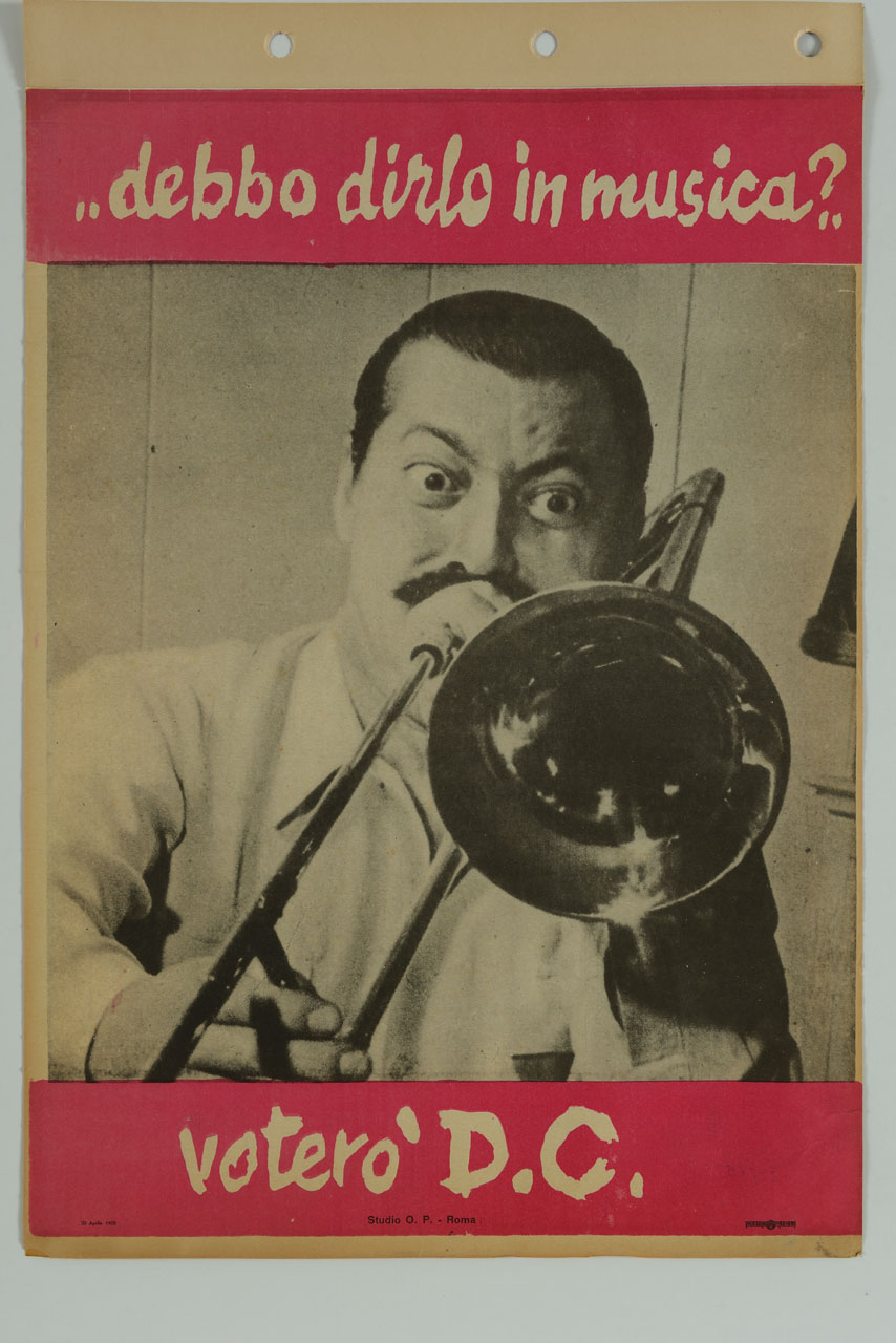 Lettura iconografica: figura maschile; trombettista; trombone. Categoria merceologica/ tipo evento: informazione e comunicazione; propaganda politica; propaganda elettorale; politica; partiti politici. Nomi: DC; Democrazia Cristiana