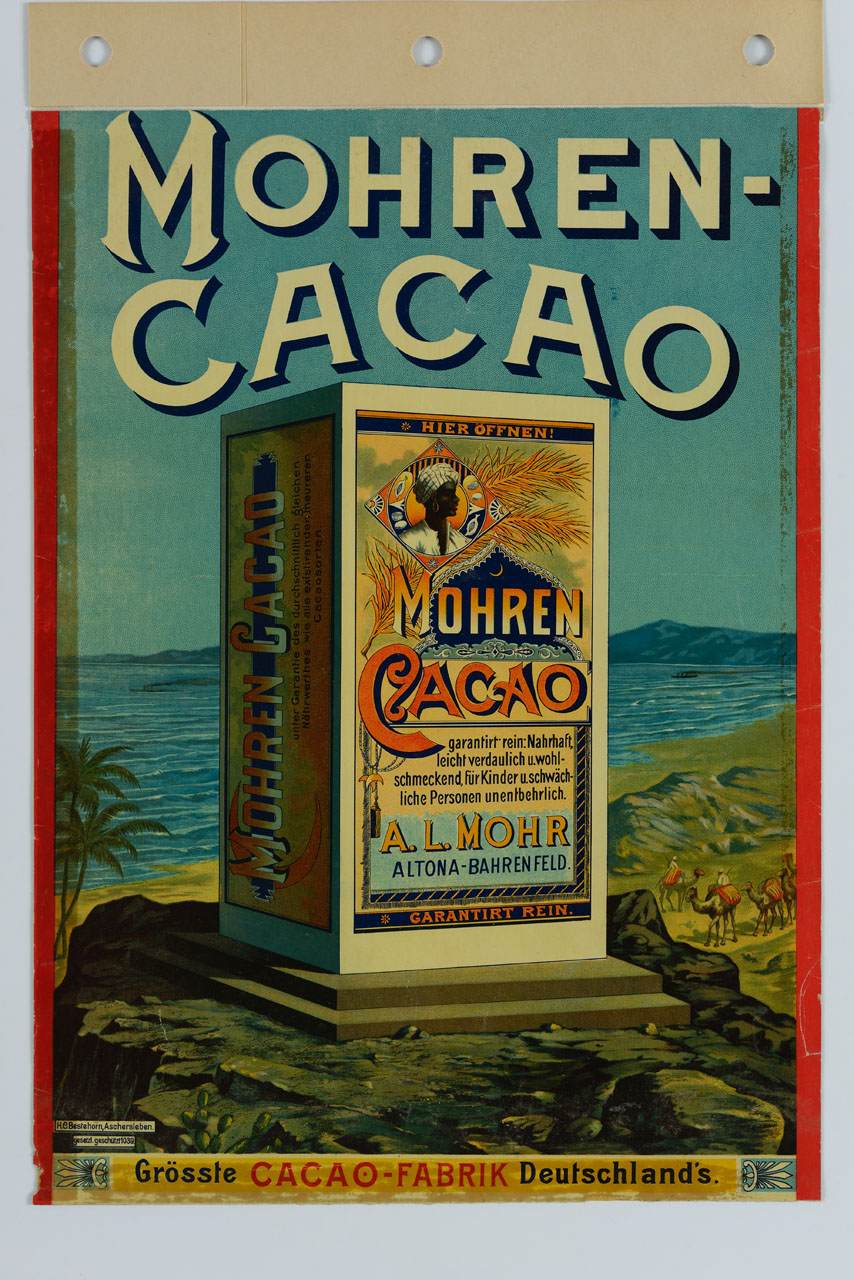 Lettura iconografica: scatola; confezione; piedistallo; figure maschili; cammelli; palme; mare; piroscafi. Categoria merceologica/ tipo evento: industria alimentare; cacao; cacao in polvere. Nomi: Mohren Cacao; A. L. Mohr. Luoghi: Deutschland; Germania; Hamburg; Amburgo; Altona; Bahrenfeld