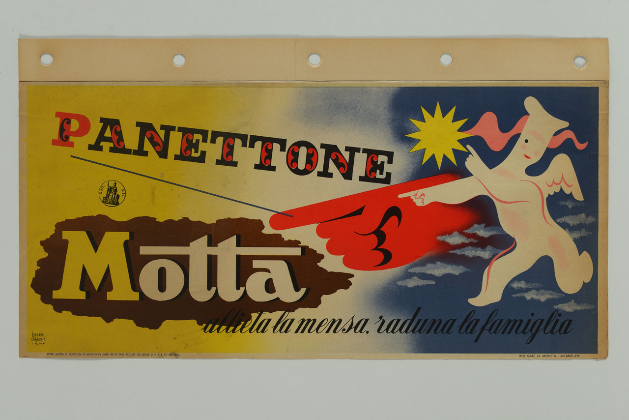 Lettura iconografica: angelo; cappello da cuoco; stella cometa; mano; indice puntato; nuvole. Categoria merceologica/ tipo evento: industria alimentare; prodotti da forno; pasticceria; panettone. Nomi: Motta; Panettone Motta; Angelo Motta. Luoghi: Milano
