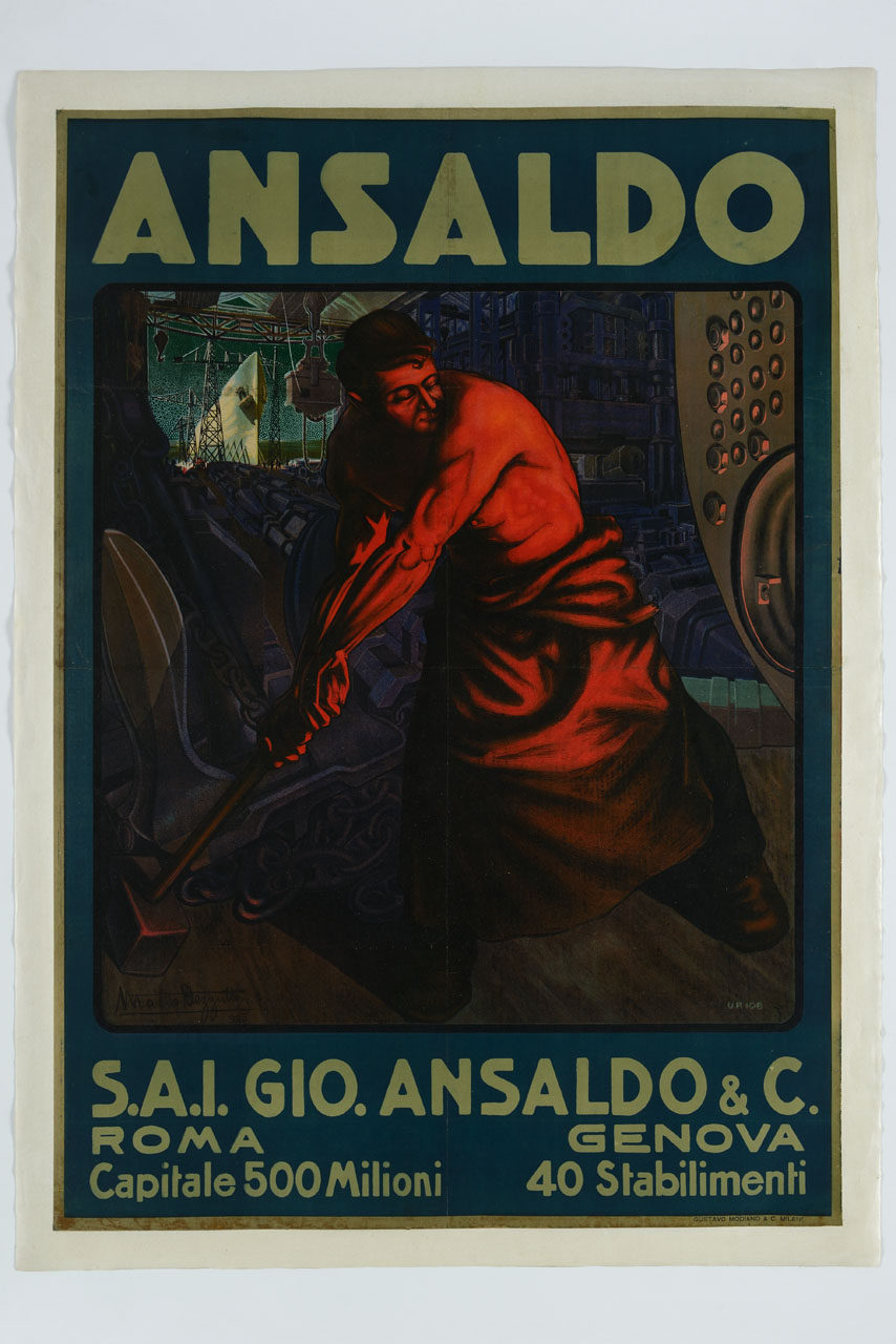 Lettura iconografica: figura maschile; operaio; martello; ancora; nave; gru; ganci; cantiere navale. Categoria merceologica/ tipo evento: industria meccanica; mezzi di trasporto navali; cantiere navale. Nomi: S.A.I. Gio Ansaldo C.. Luoghi: Roma; Genova