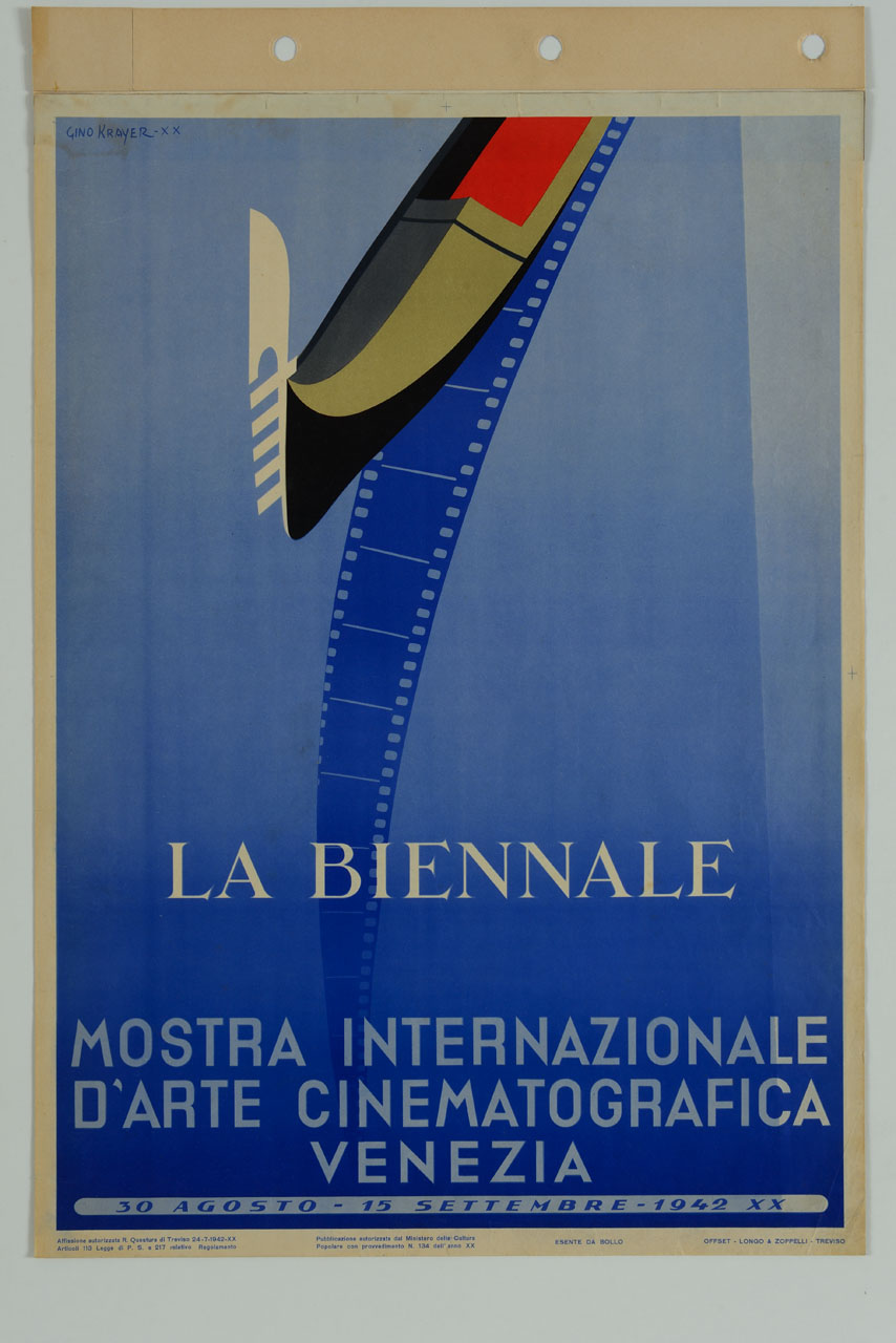 Lettura iconografica: pellicola cinematografica; gondola; prua di gondola. Categoria merceologica/ tipo evento: cinema; mostre. Nomi: La Biennale; Mostra Internazionale d'Arte cinematografica. Luoghi: Venezia