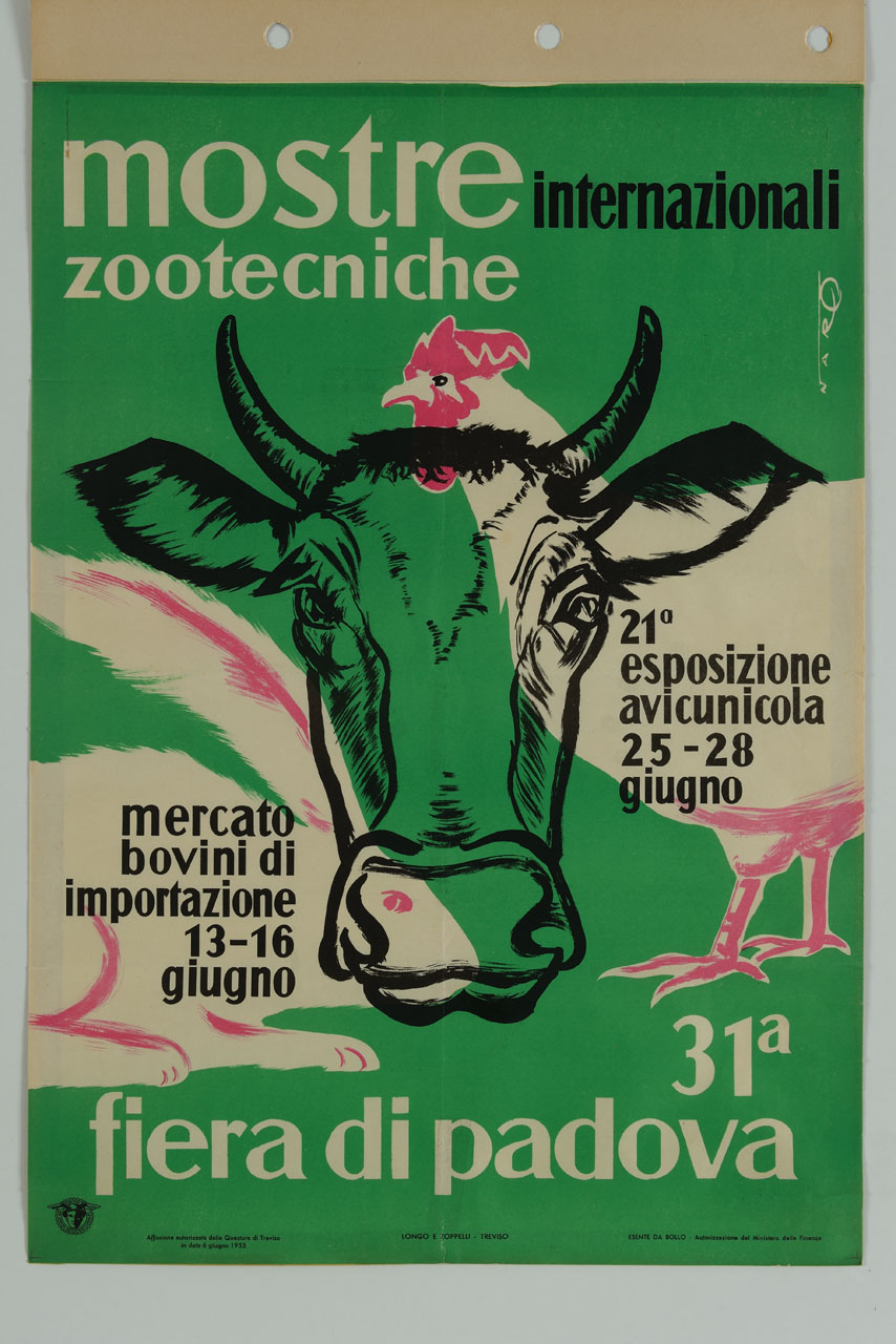 Lettura iconografica: gallina; coniglio; bovino. Categoria merceologica/ tipo evento: industria meccanica; macchine zootecniche; allevamento; bovini; pollame; conigli; uccelli; commercio; fiere; mostre mercato; associazioni economiche. Nomi: Mostre Internazionali Zootecniche; 21 Esposizione avicunicola; Mercato bovini di importazione; 31 Fiera di Padova; Union des Foires Internationales. Luoghi: Padova
