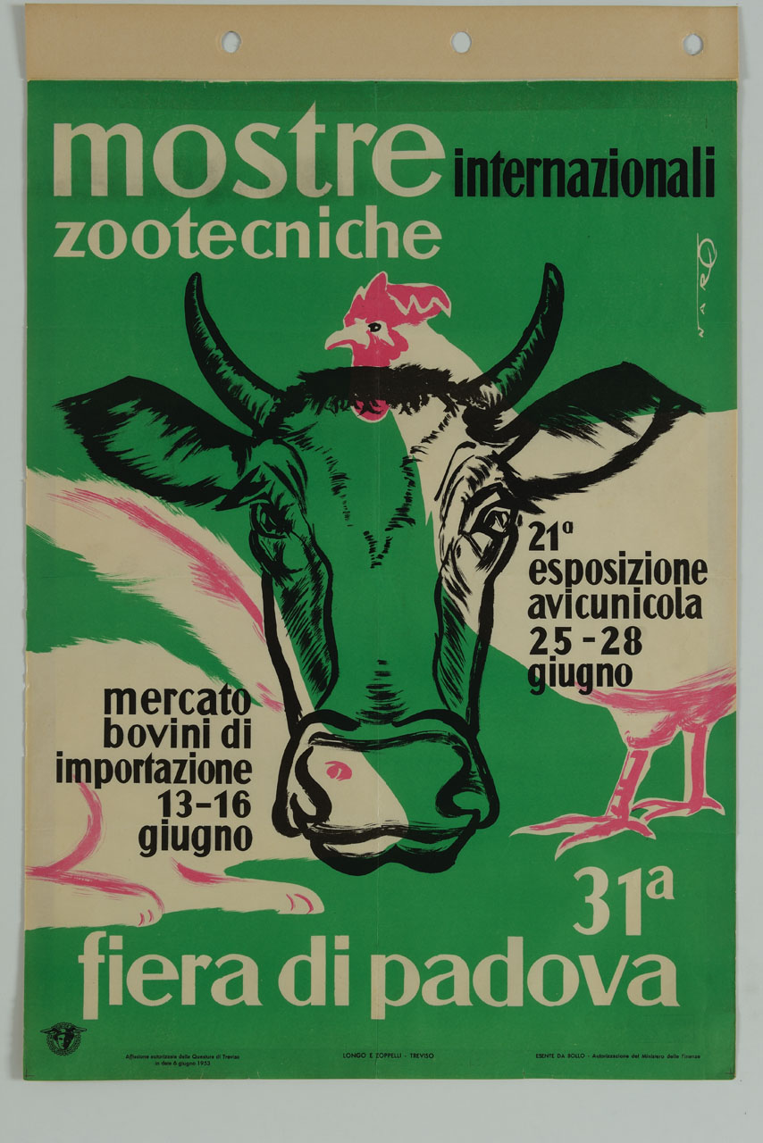 Lettura iconografica: gallina; coniglio; bovino. Categoria merceologica/ tipo evento: industria meccanica; macchine zootecniche; allevamento; bovini; pollame; conigli; uccelli; commercio; fiere; mostre mercato; associazioni economiche. Nomi: Mostre Internazionali Zootecniche; 21 Esposizione avicunicola; Mercato bovini di importazione; 31 Fiera di Padova; Union des Foires Internationales. Luoghi: Padova