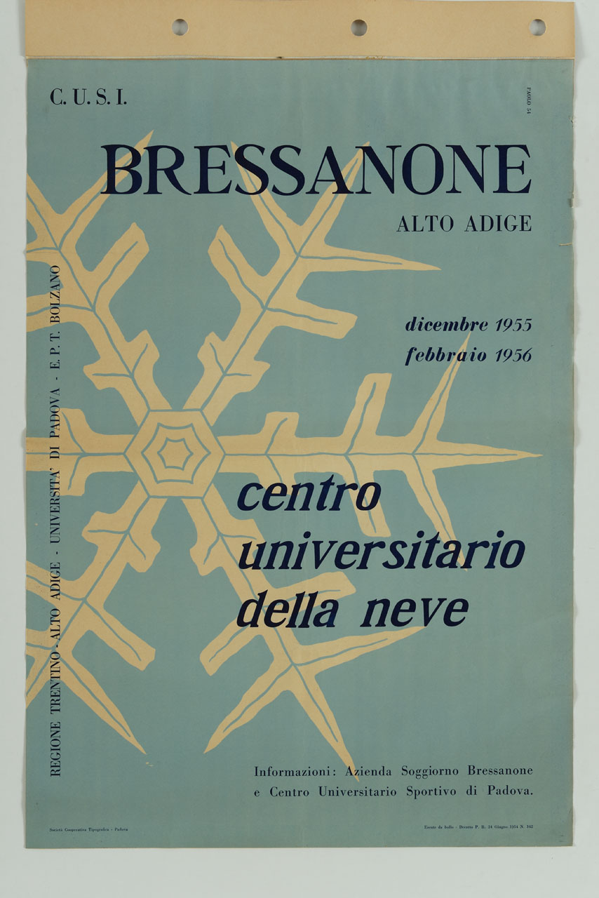 Lettura iconografica: cristallo di ghiaccio. Categoria merceologica/ tipo evento: istruzione; università; sport; sci; associazioni sportive; turismo; montagna; amministrazione pubblica; amministrazione centrale; istituzioni; enti di promozione turistica. Nomi: Centro Universitario della Neve; CUSI; Centro Universitario Sportivo Italiano; CUS Padova; Centro Universitario Sportivo Padova; Regione Trentino Alto Adige; EPT Bolzano; Ente Provinciale Turismo Bolzano; Università di Padova; Azienda Soggiorno Bressanone. Luoghi: Alto Adige; Bressanone