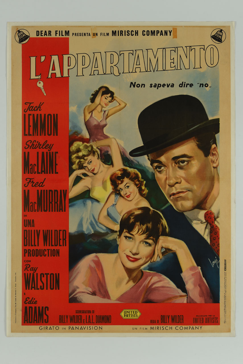 Lettura iconografica: figure femminili; viso; volto; figura maschile; cappello; bombetta; attori. Categoria merceologica/ tipo evento: cinema americano. Nomi: L'appartamento; The apartment; Jack Lemmon; Shirley Mac Laine; Fred Mac Murray; Billy Wilder Production; Ray Walston; Edie Adams; I.A.L. Diamond; Dear Film; Mirish Company; United Artists