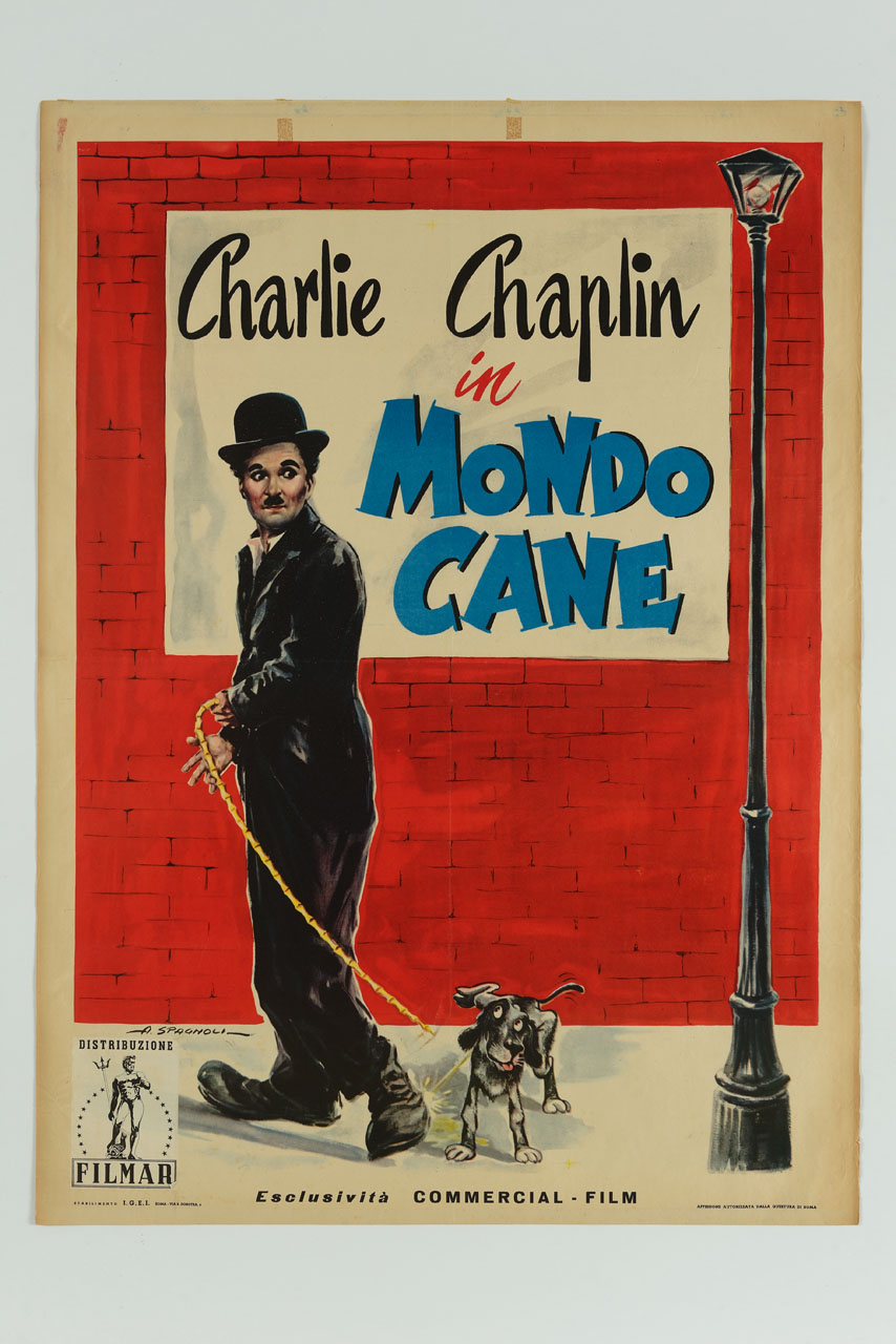 Lettura iconografica: figura maschile; cane; Charlot; bastone da passeggio; lampione. Categoria merceologica/ tipo evento: cinema americano. Nomi: Mondo cane; Vita da cani; A dog's life; Charlot inserviente di banca; The bank; Charlot infermiere; His new profession; Charlot vagabondo; The tramp; Charlie Chaplin; Filmar; Commercial Film