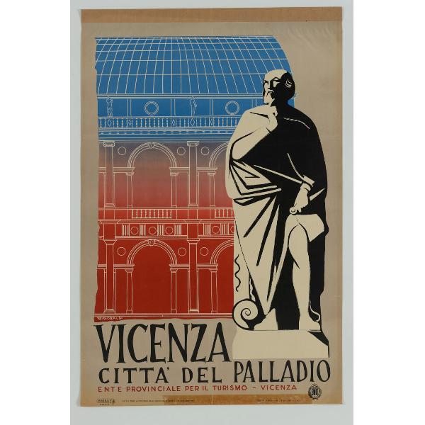 Lettura iconografica: veduta di città; architetture; Basilica Palladiana; disegno di scultura; Andrea Palladio. Categoria merceologica/ tipo evento: turismo; enti di promozione turistica. Nomi: Vincenzo Gajassi; Ente Nazionale Industrie Turistiche; ENIT; Ente Provinciale per il Turismo; EPT. Luoghi: Vicenza