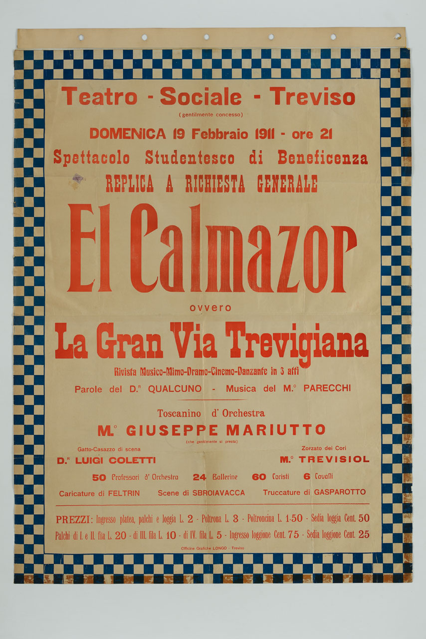 Lettura iconografica: cornice a scacchi; scritte. Categoria merceologica/ tipo evento: tempo libero; spettacolo; musica; rivista; raccolte fondi; feste; festa di carnevale. Nomi: Teatro Sociale; Spettacolo Studentesco di Beneficienza; El Calmazor ovvero La Gran Via Trevigiana; Giuseppe Mariutto; Luigi Coletti; Trevisiol; Feltrin; Sbroiavacca; Gasparotto. Luoghi: Treviso