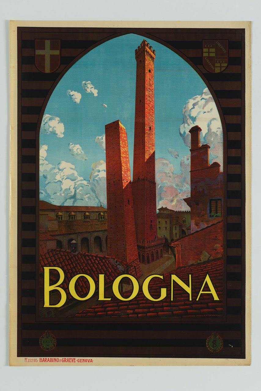 Lettura iconografica: veduta di città; architetture; Torre degli Asinelli; Torre Garisenda. Categoria merceologica/ tipo evento: turismo; enti di promozione turistica; trasporti; trasporto terrestre; compagnia ferroviaria. Nomi: Ente Nazionale Industrie Turistiche; ENIT; Ferrovie dello Stato; FS. Luoghi: Bologna