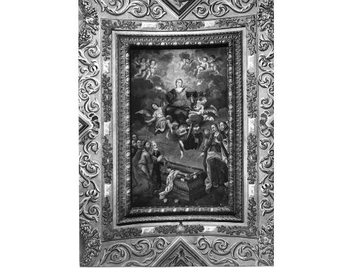 La Vergine uscita dal sepolcro è portata verso l'alto da una schiera di angeli, mentre gli Apostoli assistono stupiti al fatto. Divisi in due schiere guradano in alto quindi fissano il sarcofago aperto cosparso di rose.. Personaggi: Madonna. Figure: Apostoli; angeli. Oggetti: Sarcofago
