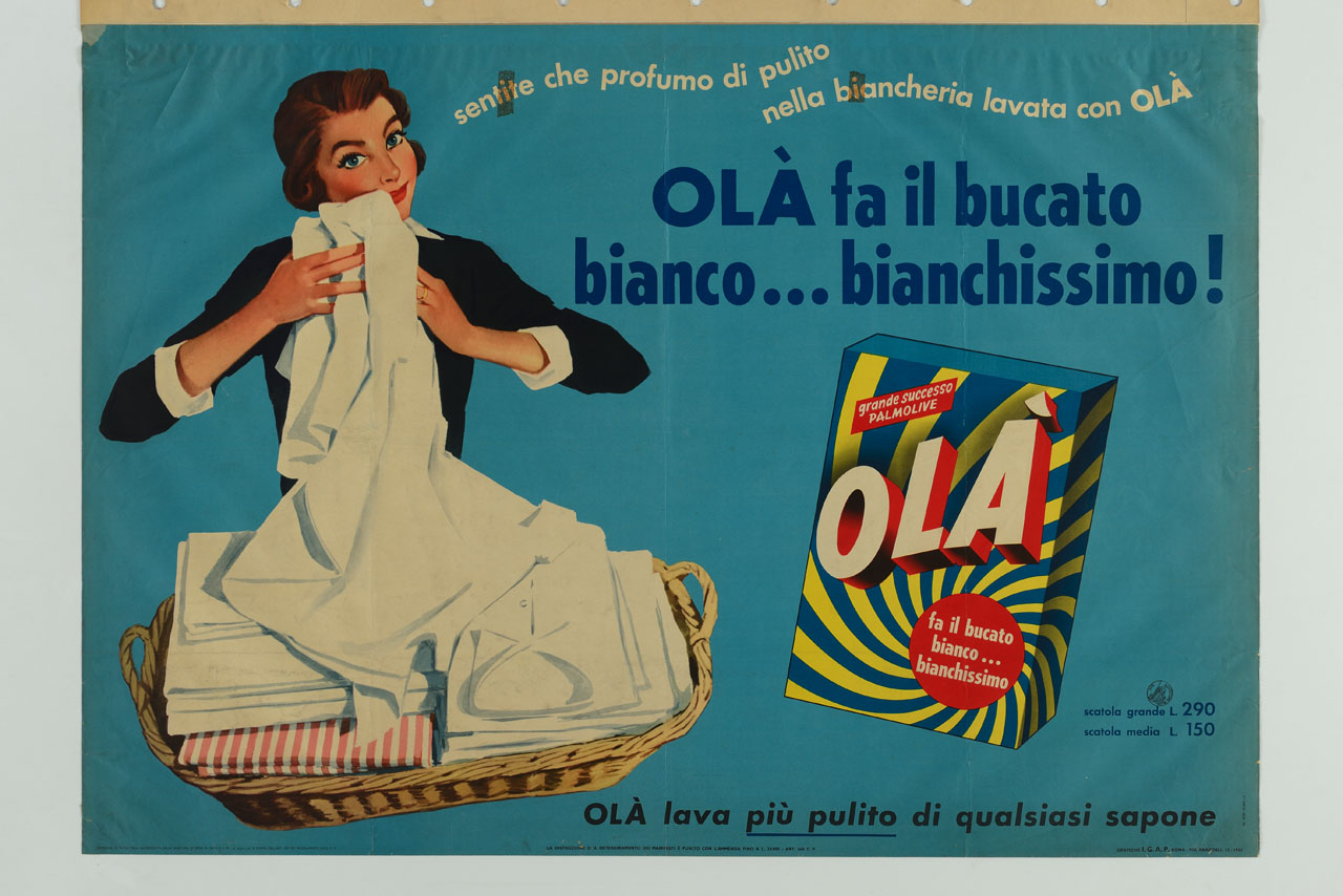 Lettura iconografica: figura femminile; bucato; cesta; scatola; confezione. Categoria merceologica/ tipo evento: industria chimica; saponi e detergenti; detersivo per bucato. Nomi: Colgate Palmolive Company; Palmolive; Olà. Luoghi: USA; United States of America; Stati Uniti d'America; New York
