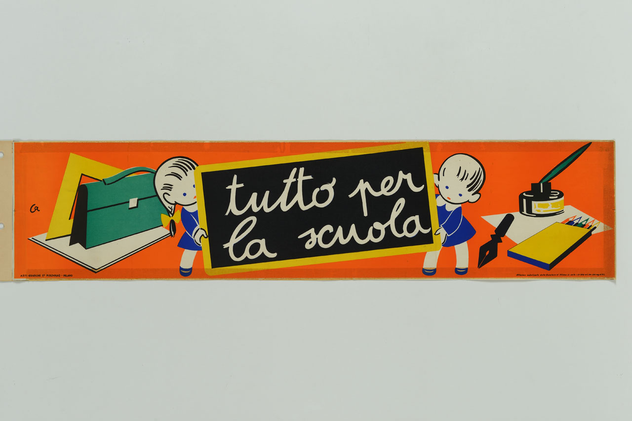 Lettura iconografica: bambino; bambina; fiocco; grembiule; scarpa; cartella; lavagna; pennino; calamaio; penna; foglio; pastello; scatola di pastelli. Categoria merceologica/ tipo evento: industria della carta; prodotti di cartoleria; foglio; scatola; industria manifatturiera; prodotti di cancelleria; penna; pastello; calamaio