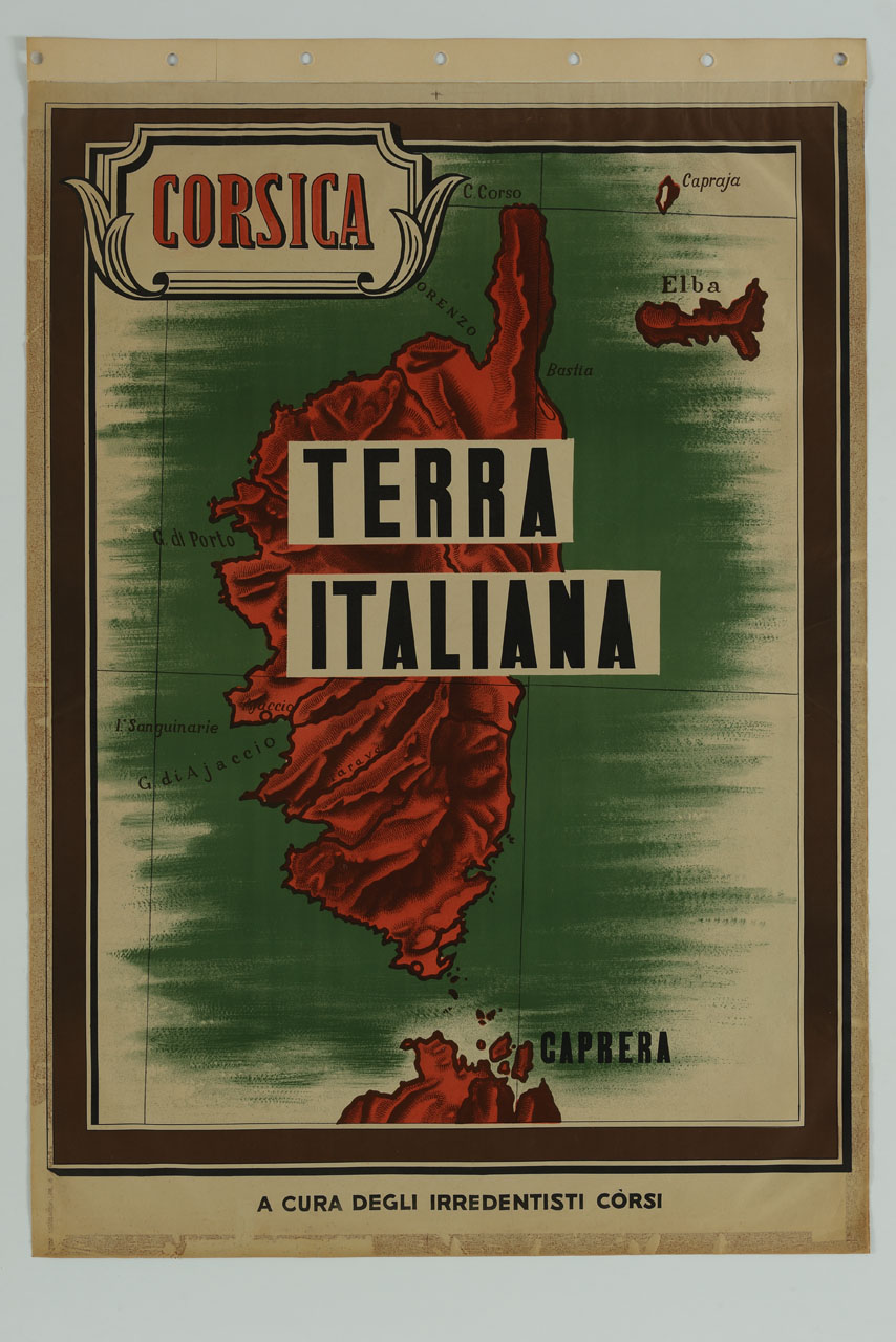 Lettura iconografica: carta geografica; isola; cartiglio. Categoria merceologica/ tipo evento: informazione e comunicazione; propaganda politica. Nomi: Irredentismo corso. Luoghi: Corsica; Cap Corse; Capo Corso; isola di Capraia; Capraia; isola d'Elba; Elba; Bastia; San Florenzo; Saint Florent; Golfo di Porto; Isole Sanguinarie; Sanguinaires; Golfo di Ajaccio; Taravo; Caprera