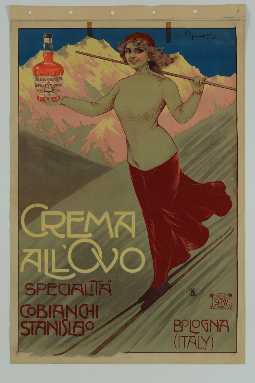 Lettura iconografica: figura femminile; sciatrice; sci; montagna; neve; bottiglia. Categoria merceologica/ tipo evento: industria alimentare; bevande; liquori; crema all'uovo. Nomi: Crema all'Ovo; Cobianchi Stanislao. Luoghi: Bologna; Borgo Panigale