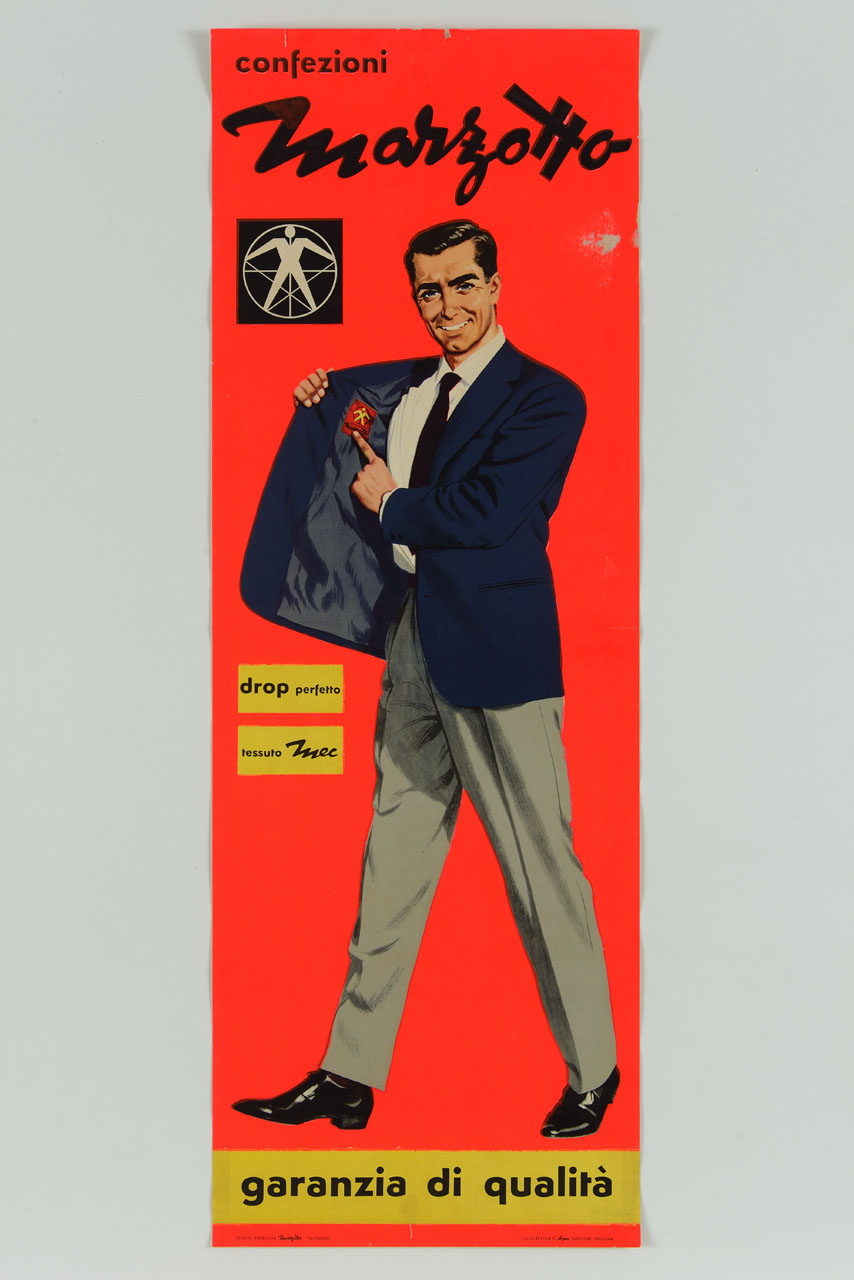 Lettura iconografica: figura maschile; giacca; camicia bianca; cravatta; pantalone. Categoria merceologica/ tipo evento: sartoria; moda; industria tessile; tessuti; abbigliamento; giacca; pantaloni. Nomi: Marzotto; Mec. Luoghi: Vicenza; Valdagno