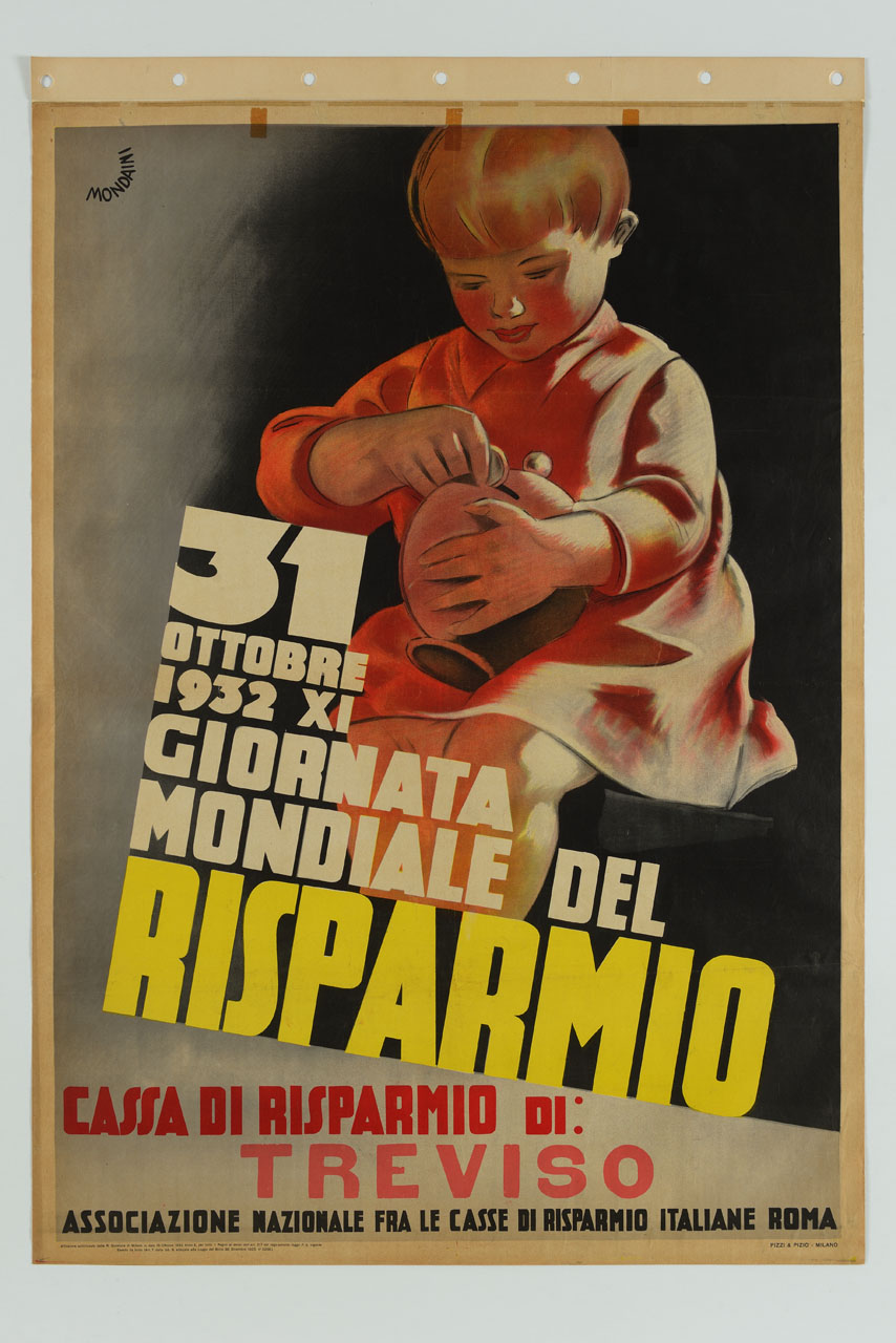Lettura iconografica: figura maschile; bambino; salvadanaio. Categoria merceologica/ tipo evento: attività finanziarie e assicurative; banche; feste. Nomi: XI Giornata Mondiale del Risparmio; Associazione Nazionale fra le Casse di Risparmio Italiane. Luoghi: Treviso; Roma