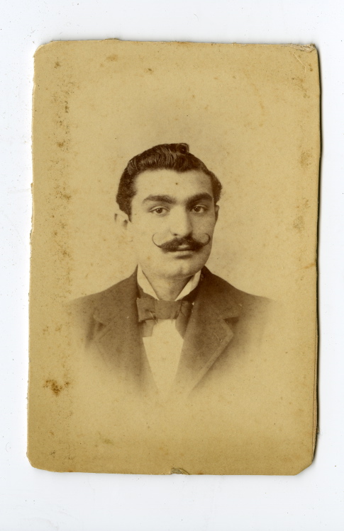 Uomo - Ritratti fotografici, fotografia di tipo ritrattistico: in posa un uomo dai caratteristici baffi con le punte verso l'alto; un grande papillon al collo gli ferma la camicia